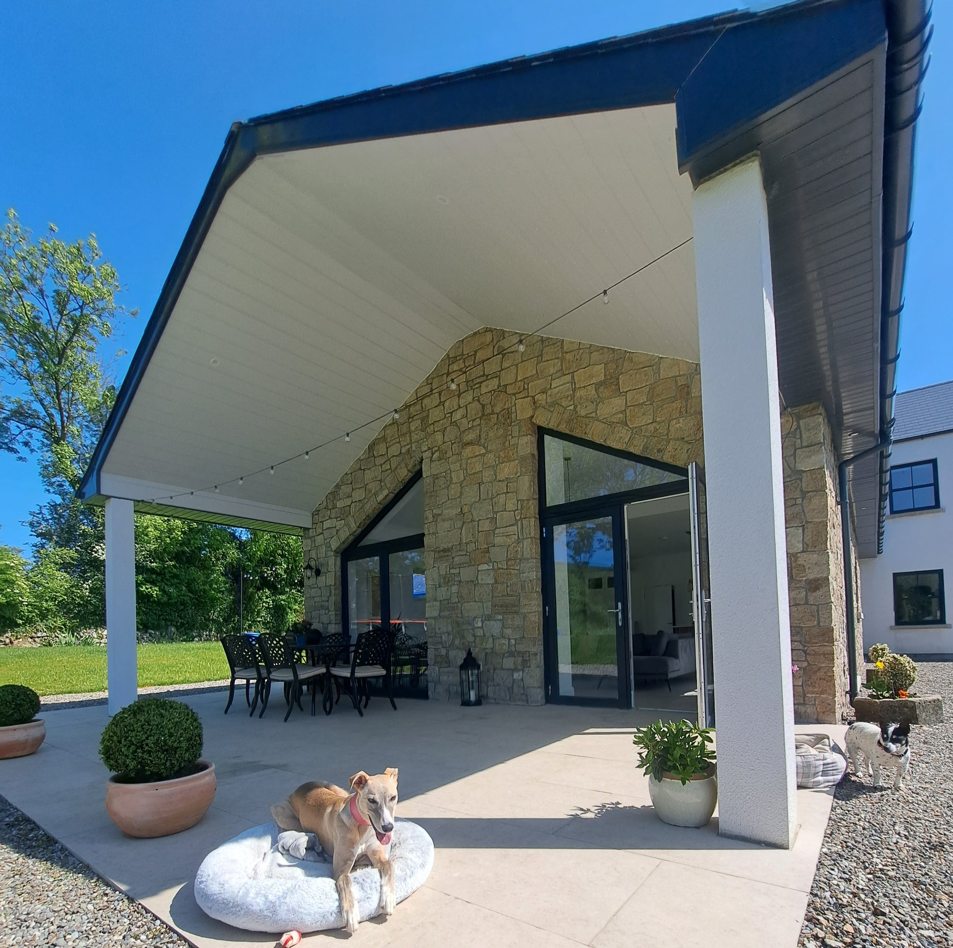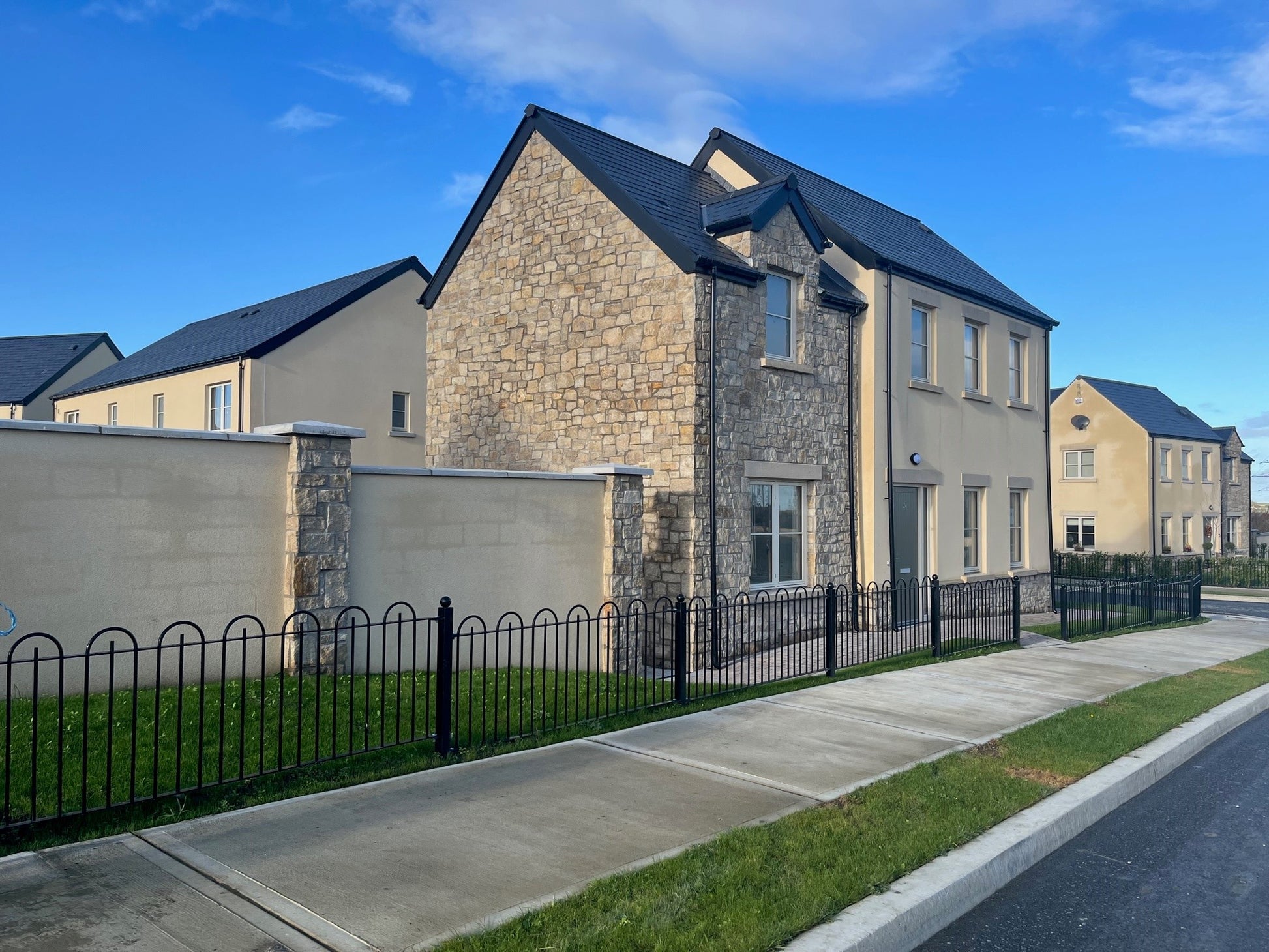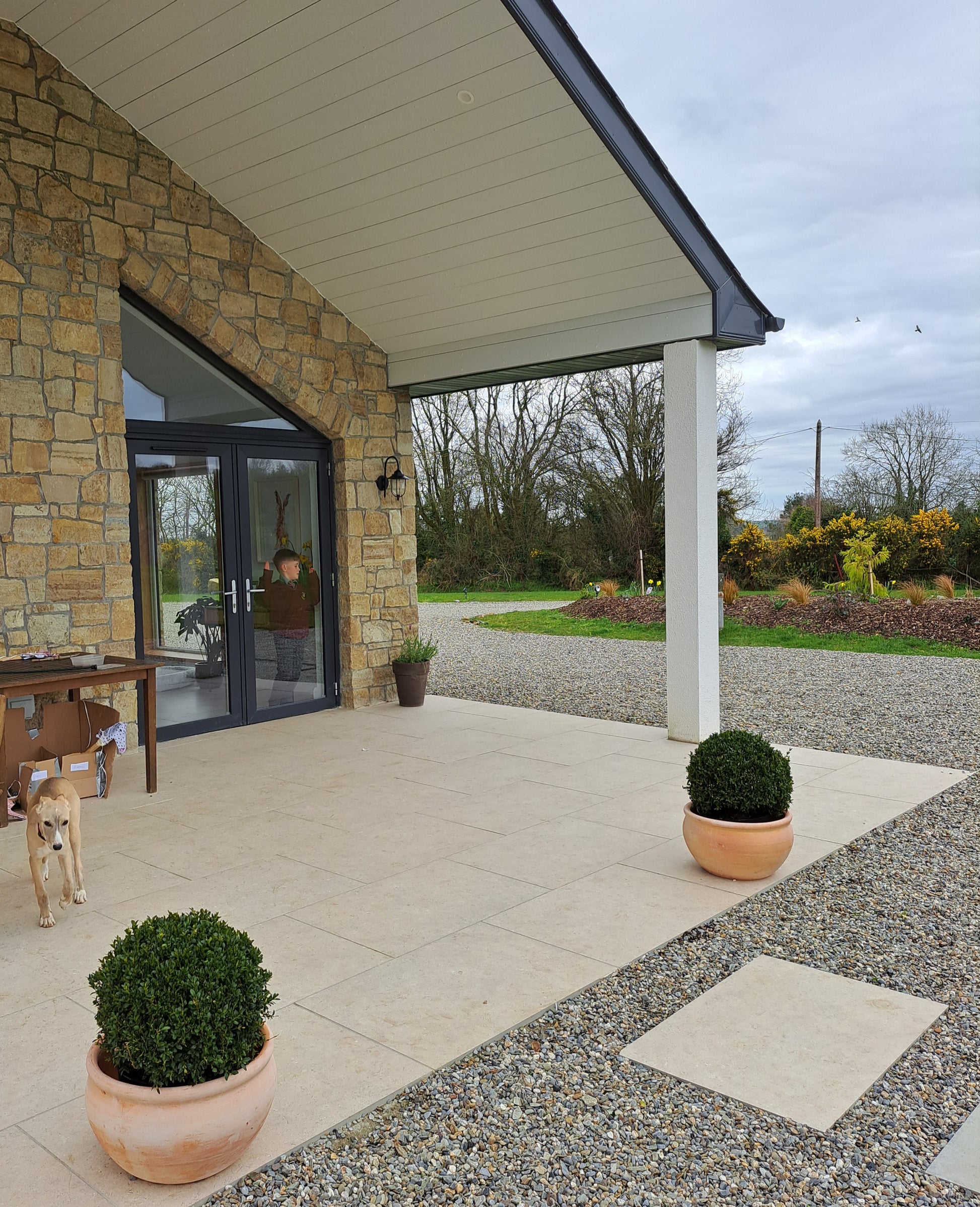 Golden brown in colour, our Grit Sandstone Stoneer Flats are produced at our facility in Mountcharles, Co. Donegal. Featuring a granite-like gritty surface texture, this material is a popular choice for both internal and external applications, including house facades, fireplaces, porches, and boundary walls. Please note that due to production difficulties, we are currently unable to guarantee the availability of L-shape corner pieces for this material.